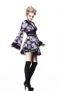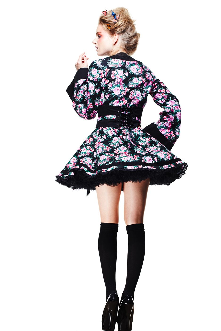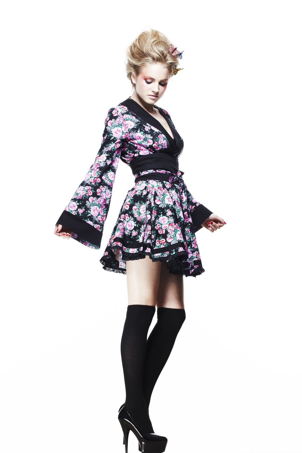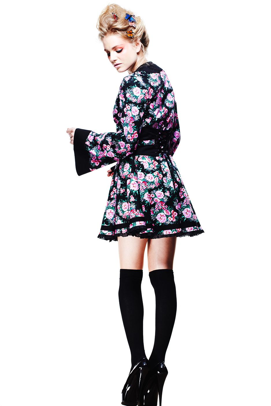 This Japanese inspired Kimono Dress is truly irresistible. It features a wide cumberband belt with front lacing, wide bell sleeves and a slightly flared skirt. This wrap around dress can be worn with or without tights underneath. The skirt has black cotton lace piping and a beautiful pink floral print. This is a stand out piece you will be noticed in this punkish, rock and roll modern pinup look. Cosplay girls this is you ! ALL SALE ITEMS ARE FINAL SALE NO RETURNS REFUNDS OR EXCHANGES .