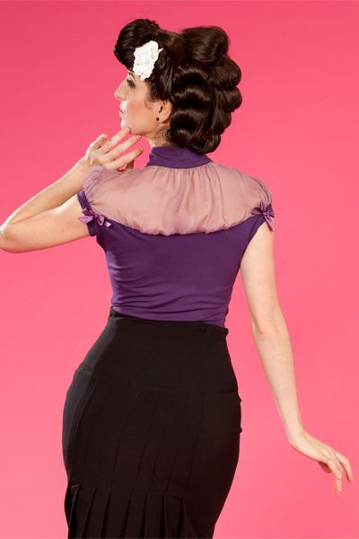 Amy - Lyn ( purple ) Stunning and divine in every way this glamorous stretch top with shirred silky fabric on shoulders, adorned with satin bows the bodice is made of a soft stretch fabric. Can be worn with our high waisted wiggle skirt, a beautiful addition to any pinup girls wardrobe. Available in Mauve, White and Black, Red/Black