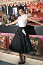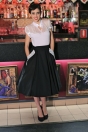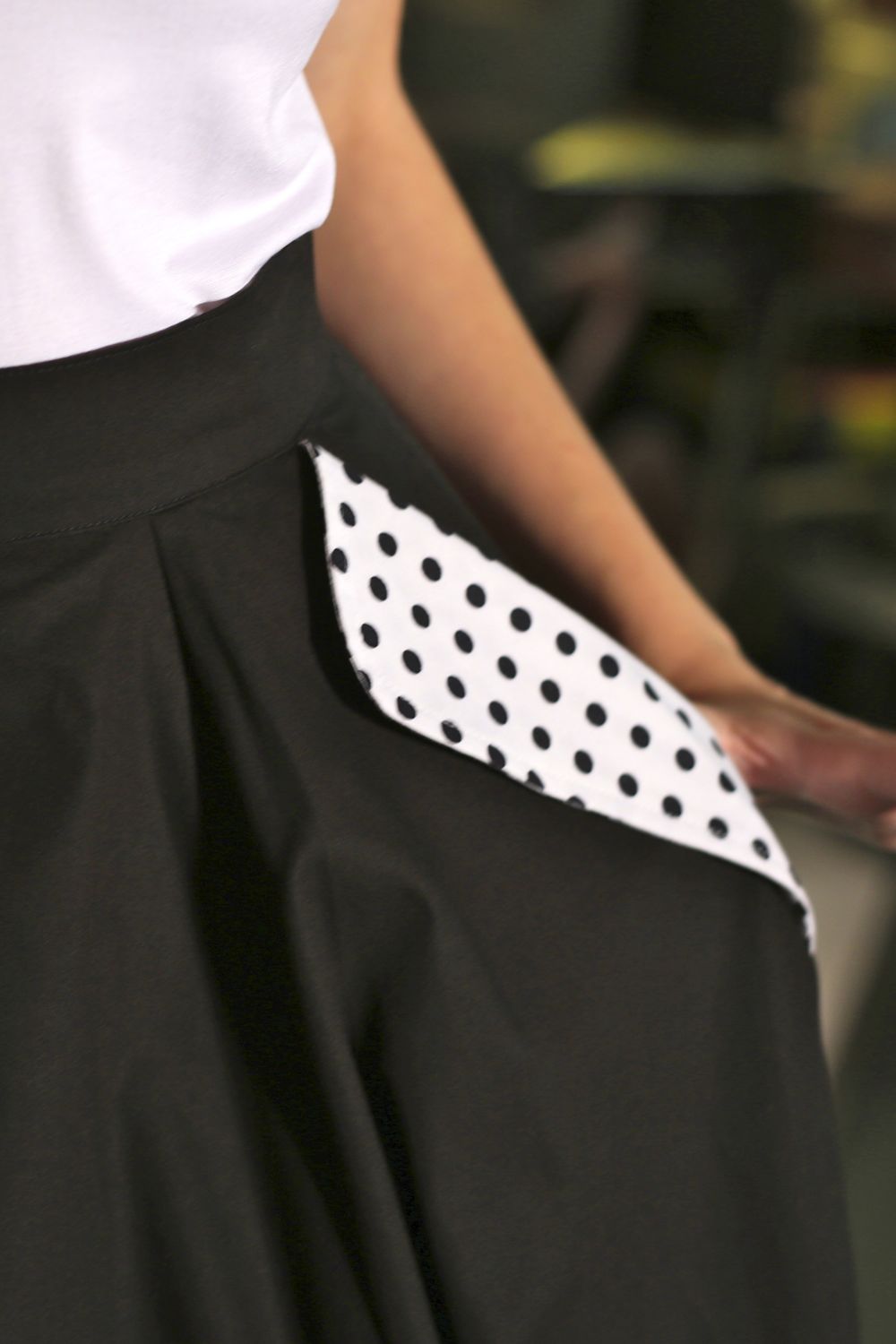 Miss Callista - Lou Retro a go-go in this 50's inspired skirt. It will make you want to shake rattle and roll. It falls just below the knees and has striking 50's style. Black full circle skirt with white and black polka dot 50'S style pockets.This skirt has a back zipper the fabric is cotton the full skirt look can be achieved with a petticoat, available on our website in Petticoats . Saturday night at the movies!!