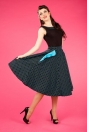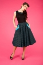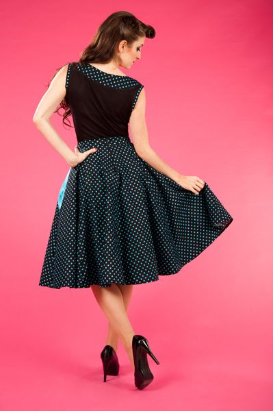 Miss Cassie - Kat Swing and jive in this delightful full circle skirt. It falls just below the knees and has striking 50's style. Aqua pockets. The main fabric is black with aqua polka dots.This skirt has a back zipper the fabric is cotton ,the full skirt look can be achieved with a petticoat which can be purchased on our website in Petticoats .This skirt is a rebel without a cause!!