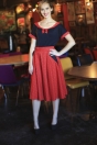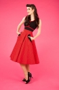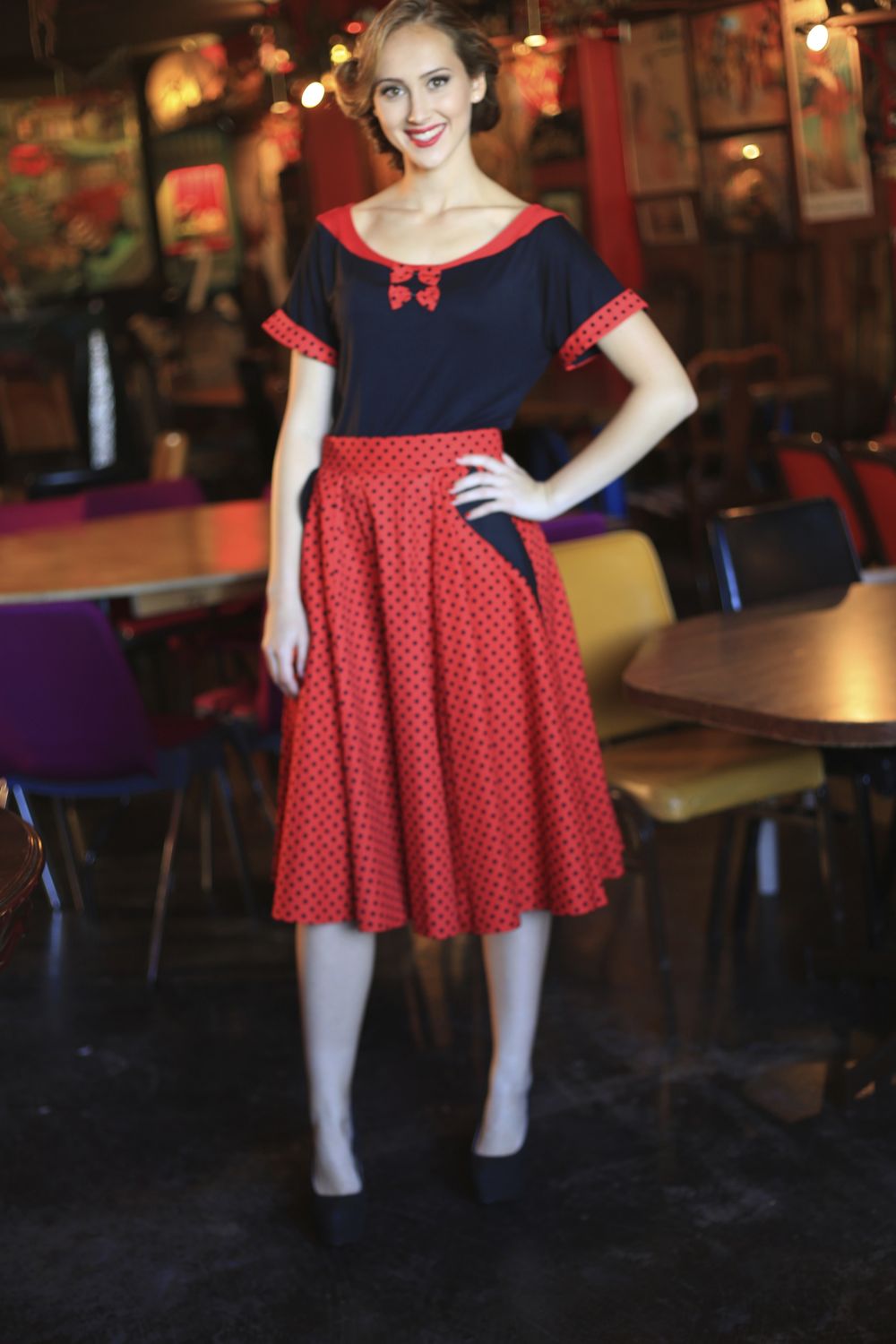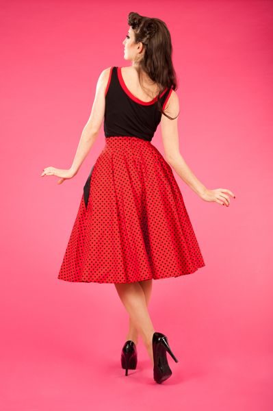 Miss Cassie- Rose Polka dot skirt This modern classic will take you straight back to the 50's. It falls just below the knees and has striking 50's style black pockets and a back zipper the fabric is cotton. The full skirt look can be achieved with a petticoat, available in petticoats The main fabric is red with small black polka dots. It has a full skirt. Swing baby swing!!