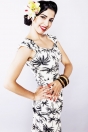 THIS IS UK SIZING PLEASE CHECK THE SIZE CHART THE PARTY DRESS THAT EVERY GIRL NEEDS ! Introducing the Creme Palm Pencil dress. This dress will create the ultimate mid century hourglass silhouette. An inner built in underlining will sculpt the figure while the covered belt highlights the cinched waist this dress creates. Other details include a faux wrap detail at the bust , gathered shoulder detailing and pleating at the waist. Created using an exclusive vintage inspired print featuring a black palm print on a cream background.