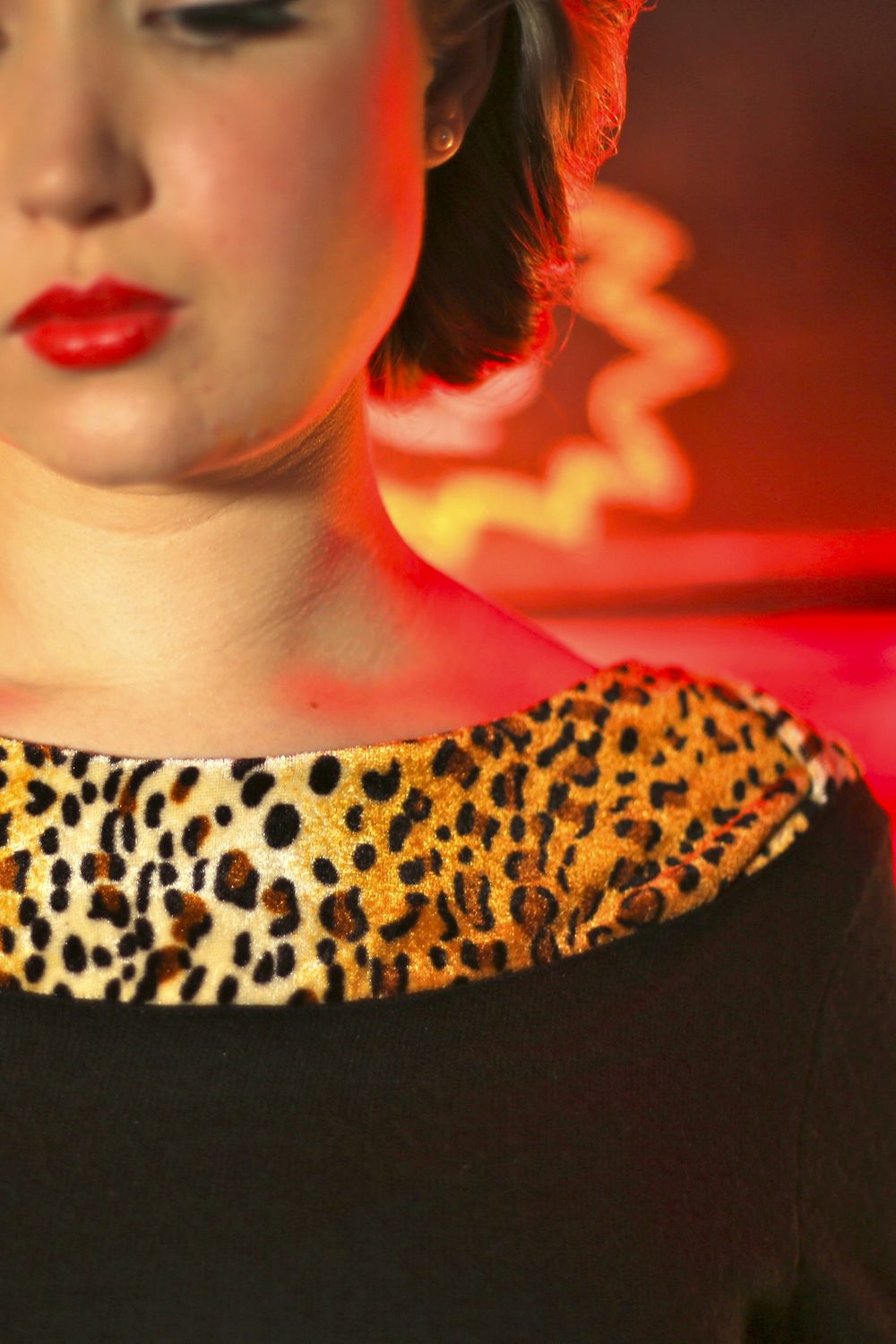 Geraldine Beautiful three quarter sleeve knit top with soft leopard shawl collar and leopard trim on the sleeve a versatile and pretty great transeasonal top perfect for a full circle skirt a true lioness !