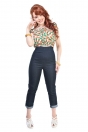 The 50's Capri pant in denim is an easy to wear mainstay piece in your modern pinup girl wardrobe so casual and comfy featuring a side zip , high waist and two back pockets . They look best rolled up a little real rockabilly style ! Wear them with flats or kitten heels the all round great weekender .Style them up with our Dolores Polka dot tops available on our website . Made of 70% cotton 28% poly 2% spandex .