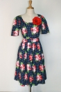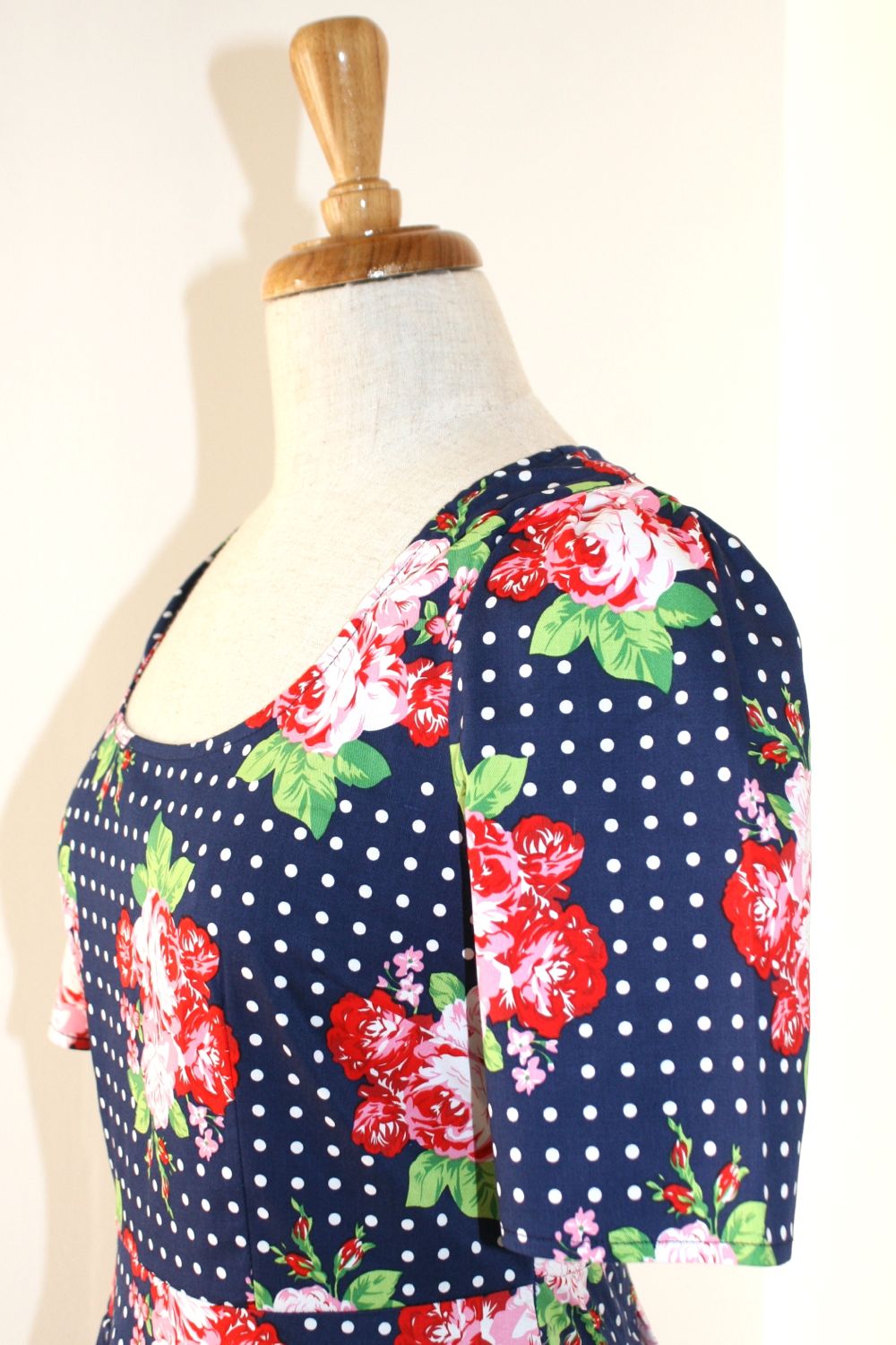 Fabulous Vintage ! this easy to wear day dress in stunning navy polka dots with lovely blooming roses pattern will be that go to dress.. featured here with a flower broach *accessories available on our website just add a cute retro hand bag this dress has an air romance ! Made of cotton with a side zipper and a bit of a sleeve great for that in between season . Accessories not included