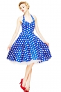 A halter neck, a sweetheart neck line and white polka dots on a gorgeous bright blue Dress. Full skirt looks fantastic with or without petticoat, back zipper, elasticised back panel for extra room and comfort. Your dance card will be full as you shake and shimmy in this 50’s classic.