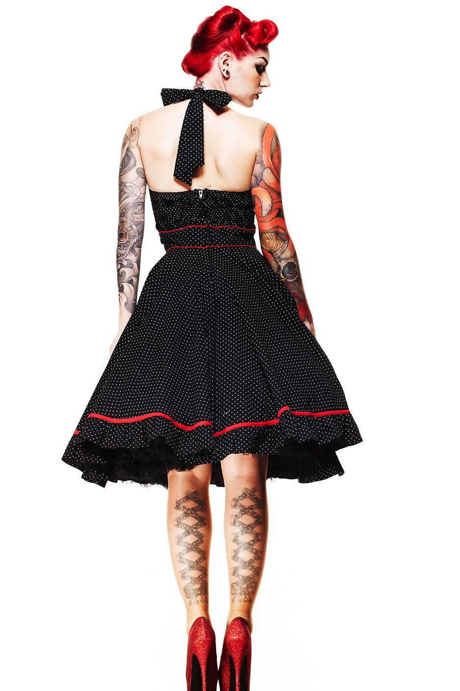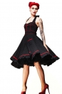 Black, white polka dot-red trim, Classic 50’s styling halter neck dress, black with small white polka dot, red piping and front lapel detail, small self covered button on front of the bodice, this dress is a real head turner, front pocket detail, back zipper elasticised back for extra comfort and room. Can be worn with a petticoat for that extra Va Va Voom. The perfect dress, a spring must have.