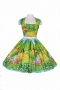By BERNIE DEXTER ..Just magical is the only way I can describe this gorgeous pinup dress in amazing vivid eye catching colours The whimsical print is just stunning , true vintage styling beautifully constructed with runching on the shoulders fitted at the waist and comes with a white patent belt and hidden pockets . Can be worn with or without a petticoat . Pictured with a petticoat which can be purchased in ACCESSORIES on our website. A Rockabilly ,Pinup Dream Dress !! A size Small is equivalent to a size 8 . Size M/10 , L/12 XL/14